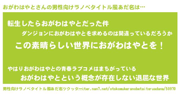 | 女子向けラノベタイトル風あだ名 | 『乙女ゲームの破滅フラグしかない悪役おがわはやとに転生してしまった…』 |