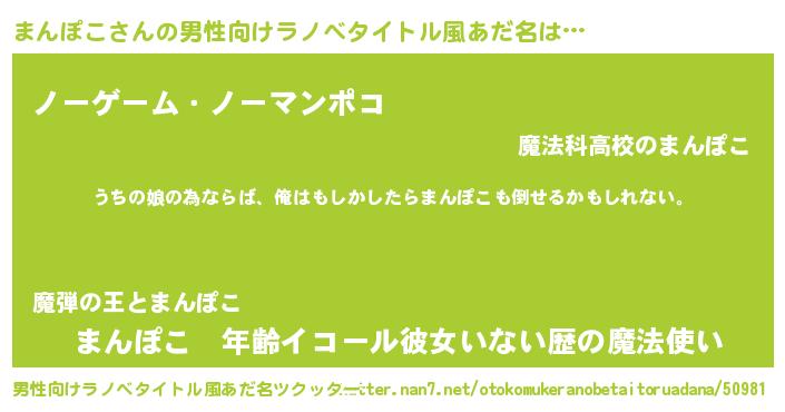 | 女子向けラノベタイトル風あだ名 | 『まんぽこ伯爵の花嫁』 |