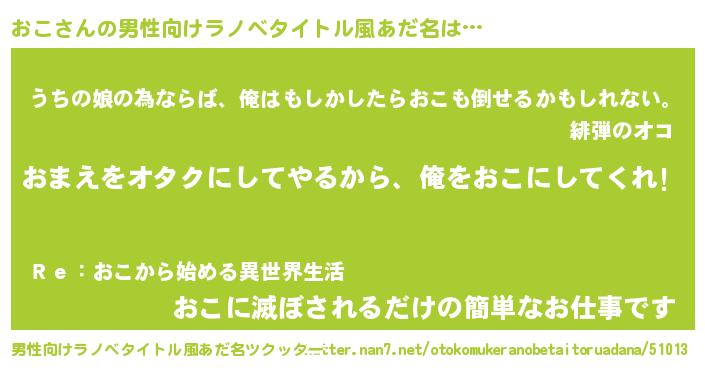 | 女子向けラノベタイトル風あだ名 | 『おこ夫妻のなれそめ』『おこの婚約者』 |