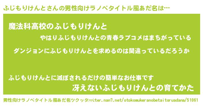| 胡散臭い通販商品みたいなあだ名 | 『信頼と実績のサプリメント…その名も「ふじもりけんと」』 |
