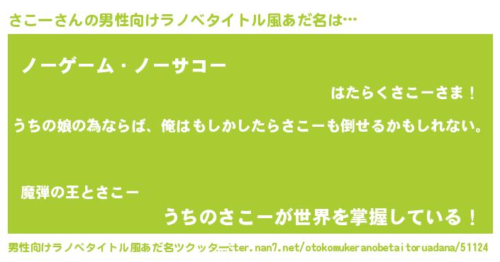 | 女子向けラノベタイトル風あだ名 | 『さこーの婚約者』『死神さこーの再婚』 |