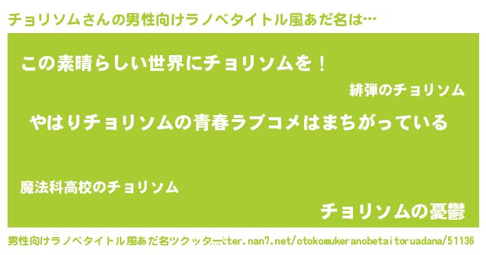 | 女子向けラノベタイトル風あだ名 | 『チョリソムの雑貨屋さん』 |