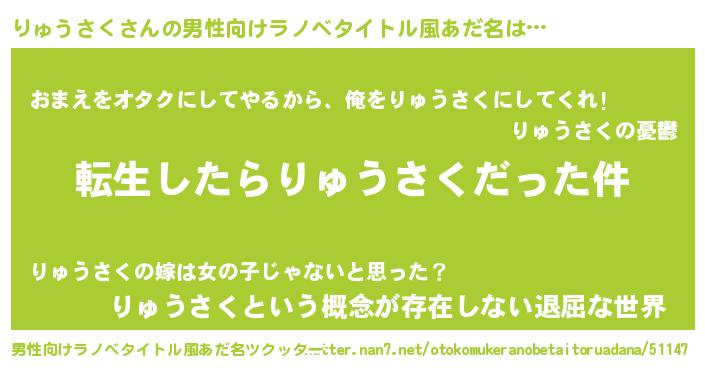 | 女子向けラノベタイトル風あだ名 | 『りゅうさくの玉の輿計画!』 |
