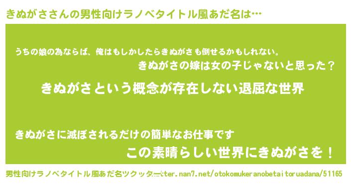 | 意味不明あだ名 | 『永久保存きぬがさ』『ペロリンきぬがさ』 |