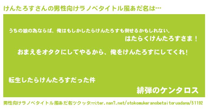 | 女子向けラノベタイトル風あだ名 | 『けんたろす夫妻のなれそめ』 |