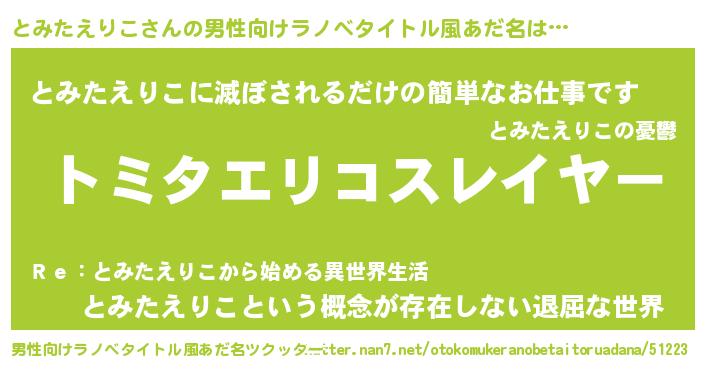 | 胡散臭い通販商品みたいなあだ名 | 『絶対に幸福をもたらす水素水…その名も「とみたえりこ」』 |