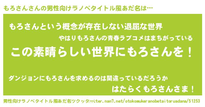 | 女子向けラノベタイトル風あだ名 | 『乙女ゲームの破滅フラグしかない悪役もろさんに転生してしまった…』 |