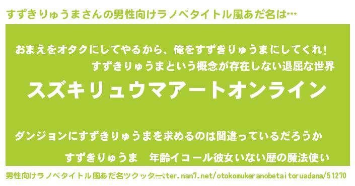 | 女子向けラノベタイトル風あだ名 | 『すずきりゅうま姫と円卓の騎士』 |