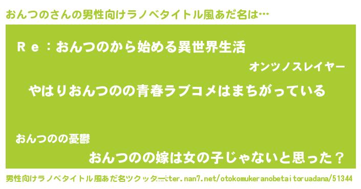 | 女子向けラノベタイトル風あだ名 | 『おんつのの雑貨屋さん』『闇のおんつの』 |