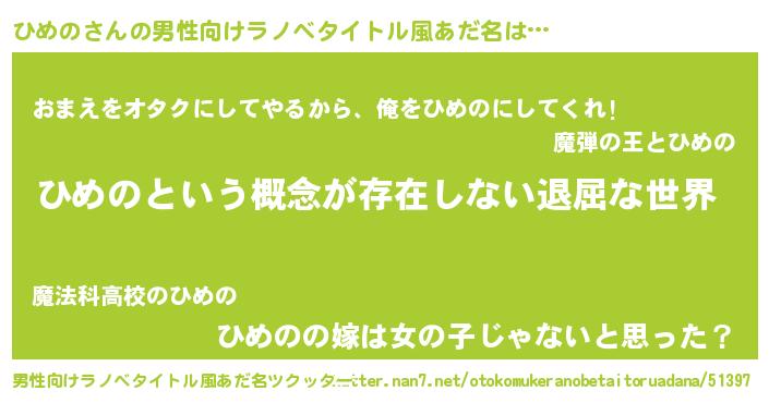 | 女子向けラノベタイトル風あだ名 | 『異世界で失敗しない100のひめの』 |