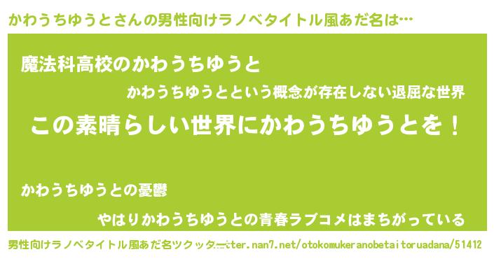 | 意味不明あだ名 | 『住所不定無職かわうちゆうと(2歳)』 |