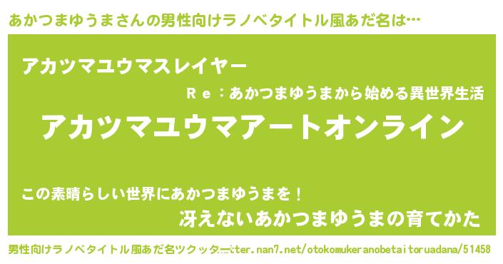 | ヘコむあだ名 | 『あかにゅー』『あかつまゆうま(笑)』 |