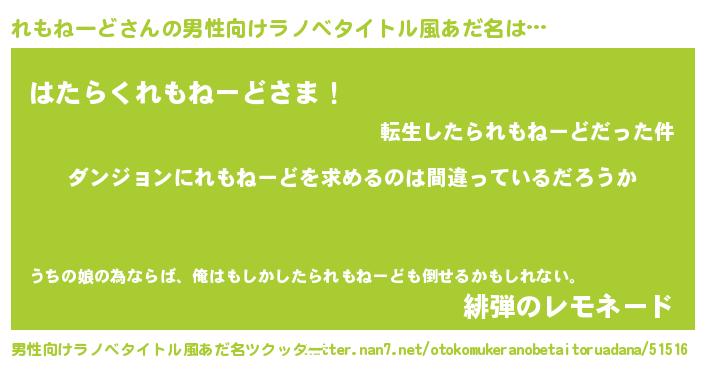 | 女子向けラノベタイトル風あだ名 | 『れもねーどは平凡を望む』 |