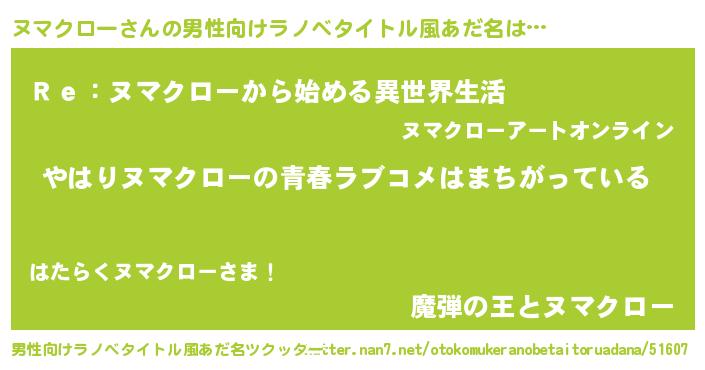 | ファンタジー風あだ名 | 『エターナルヌマクローー』『ゼヌマトゥ』 |