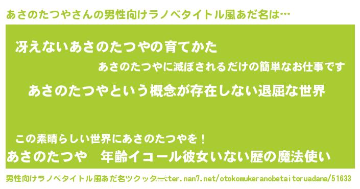 | 女子向けラノベタイトル風あだ名 | 『異世界で失敗しない100のあさのたつや』 |