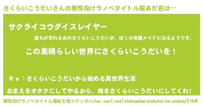 | ヘコむあだ名 | 『さくらいこうだい(震え声)』『酢こんぶ』 |