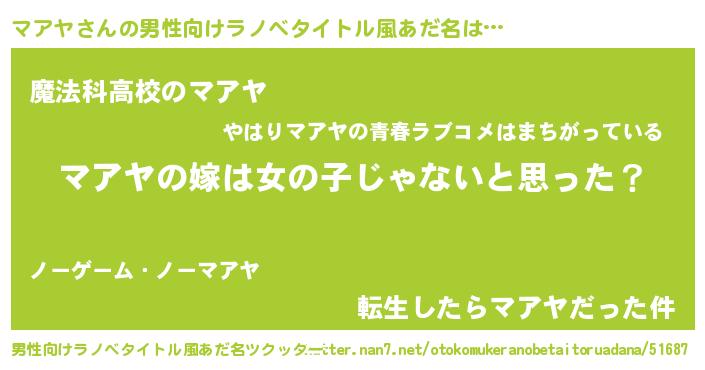| 女子向けラノベタイトル風あだ名 | 『マアヤの卵を拾いまして』 |