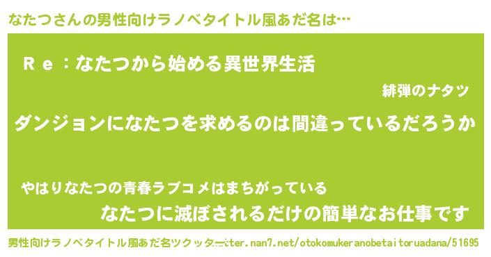 | 女子向けラノベタイトル風あだ名 | 『なたつの卵を拾いまして』『闇のなたつ』 |