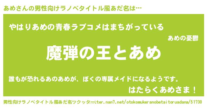 | 女子向けラノベタイトル風あだ名 | 『乙女ゲームの破滅フラグしかない悪役あめに転生してしまった…』 |