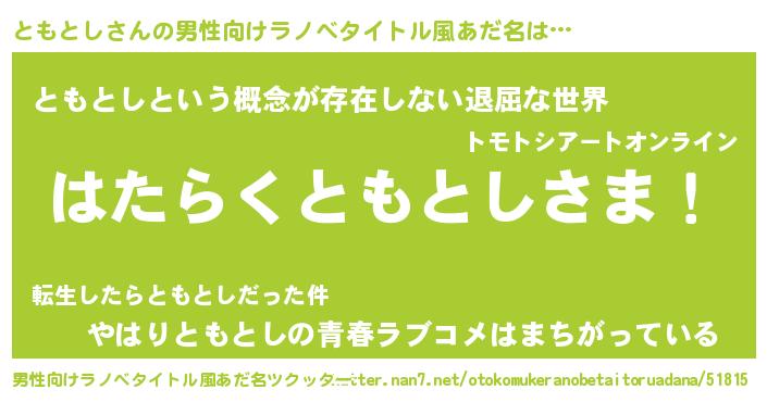 | 胡散臭い通販商品みたいなあだ名 | 『来世でも幸せになれる水素水…その名も「ともとし」』 |