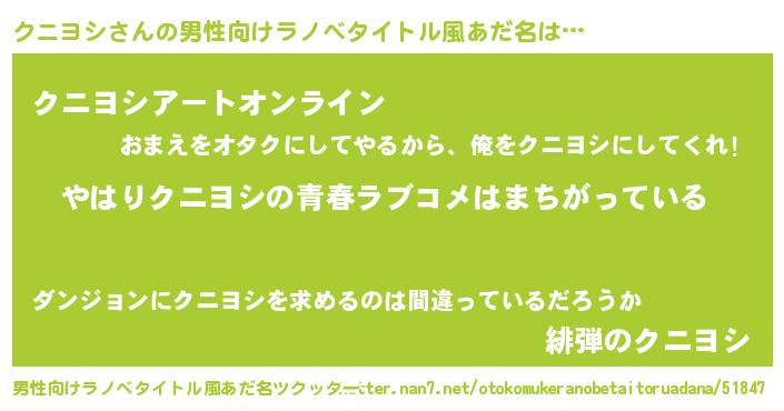 | 女子向けラノベタイトル風あだ名 | 『クニヨシ伯爵の花嫁』『クニヨシ恋絵巻』 |