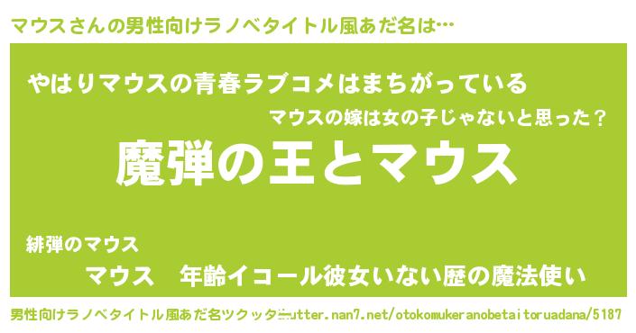 | 女子向けラノベタイトル風あだ名 | 『乙女ゲームの破滅フラグしかない悪役マウスに転生してしまった…』 |