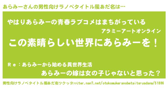 | ヒーロー風カッコイイあだ名 | 『仮面アラダー』『ウルトラあらみーマン』 |