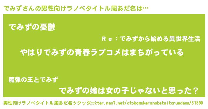 | 女子向けラノベタイトル風あだ名 | 『でみずの雑貨屋さん』『闇のでみず』 |