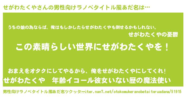 | 女子向けラノベタイトル風あだ名 | 『悪役せがわたくやに転生したようですが、知った事ではありません』 |