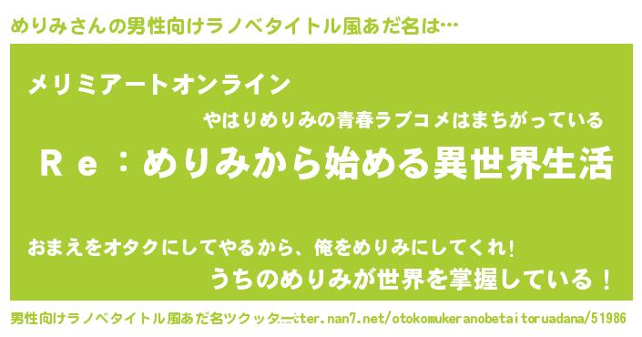 | 女子向けラノベタイトル風あだ名 | 『闇のめりみ』『男装めりみの憂鬱な任務』 |