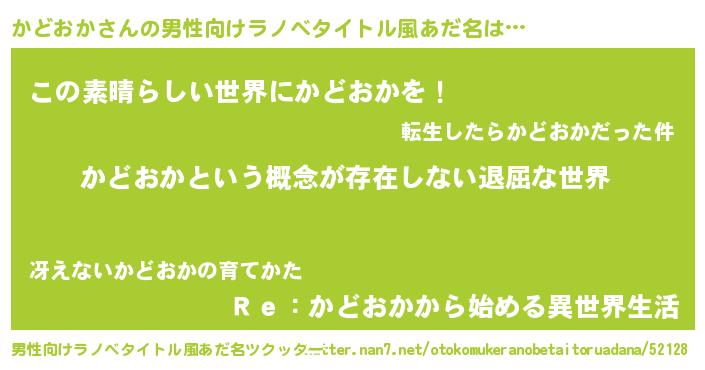 | 女子向けラノベタイトル風あだ名 | 『異世界で失敗しない100のかどおか』 |
