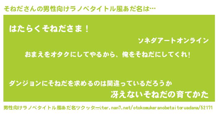 | 女子向けラノベタイトル風あだ名 | 『そねだ夫妻のなれそめ』 |