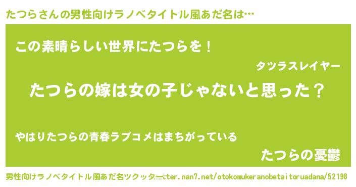 | 女子向けラノベタイトル風あだ名 | 『たつら様がみてる』『たつら伯爵の花嫁』 |