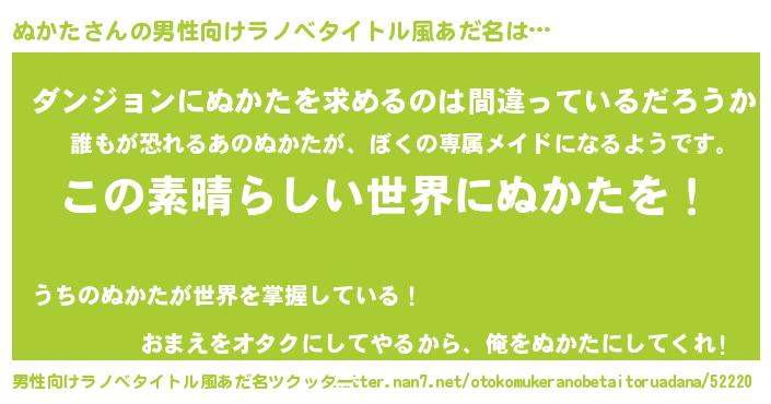 | 胡散臭い通販商品みたいなあだ名 | 『世界中を虜にした世界で10本だけ現存している希少なブランデー…その名も「ぬかた」』 |
