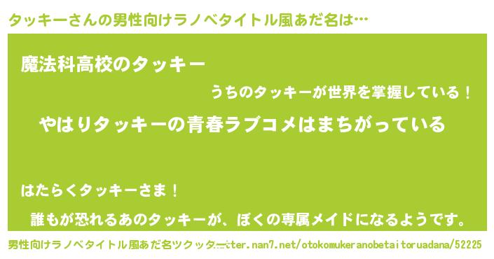 | 女子向けラノベタイトル風あだ名 | 『タッキー伯爵の花嫁』 |