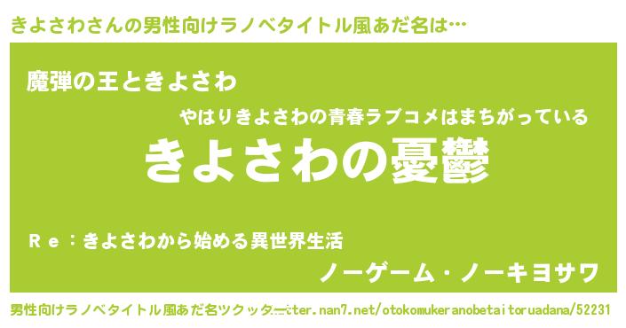 | 女子向けラノベタイトル風あだ名 | 『(仮)きよさわのやんごとなき事情』 |