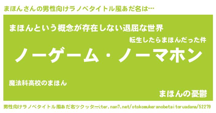 | 女子向けラノベタイトル風あだ名 | 『死神まほんの再婚』『まほんの契約王妃』 |