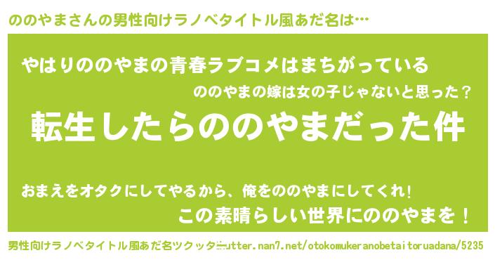 | 女子向けラノベタイトル風あだ名 | 『ののやまの玉の輿計画!』 |