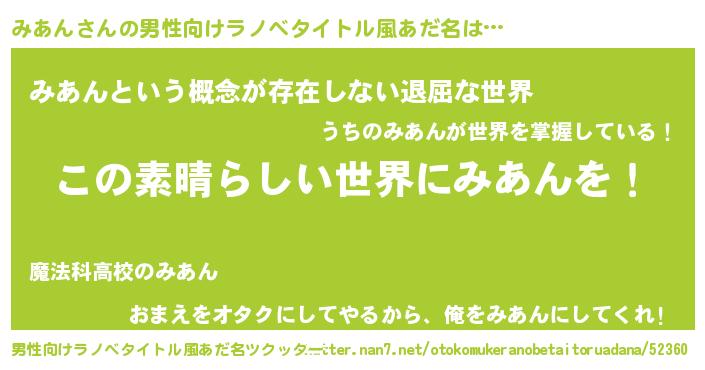 | 意味不明あだ名 | 『住所不定無職みあん(5歳)』『自称みあん』 |