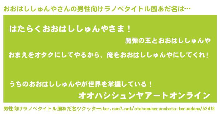 | 女子向けラノベタイトル風あだ名 | 『おおはししゅんや夫妻のなれそめ』 |