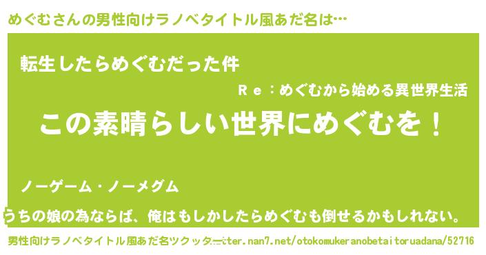 | 胡散臭い通販商品みたいなあだ名 | 『あなたにだけ特別に提供する100年もののヴィンテージワイン…その名も「めぐむ」』 |