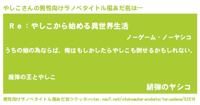 やしこさんの男性向けラノベタイトル風あだ名をツクッター!