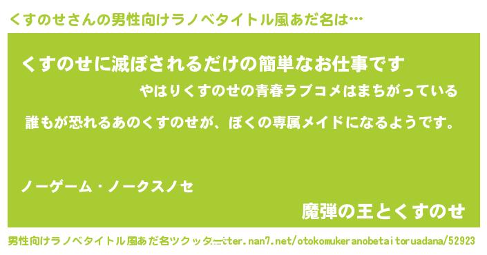 | 胡散臭い通販商品みたいなあだ名 | 『来世でも幸せになれる水素水…その名も「くすのせ」』 |