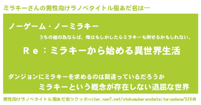 | 意味不明あだ名 | 『自称ミラキー』『永久保存ミラキー』 |
