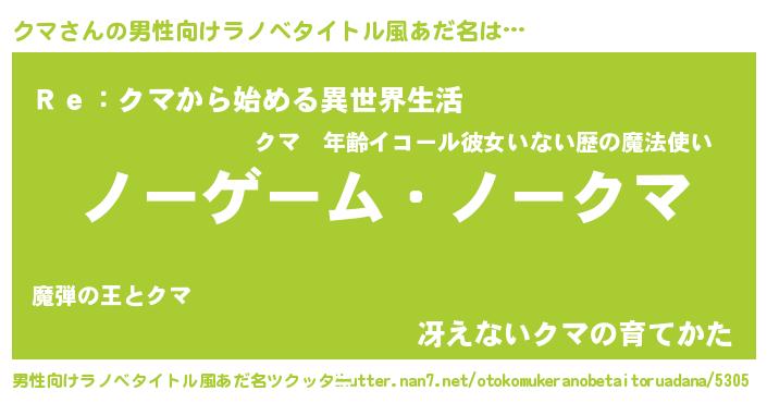 | 女子向けラノベタイトル風あだ名 | 『死神クマの再婚』『クマの玉の輿計画!』 |