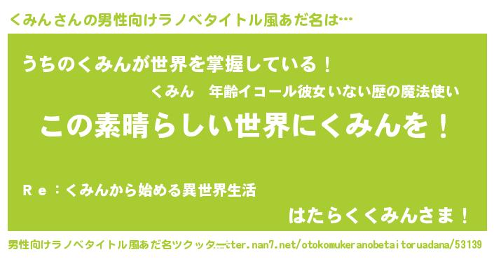 | 胡散臭い通販商品みたいなあだ名 | 『あなたにだけ特別に提供する限定10本のレアな日本酒…その名も「くみん」』 |