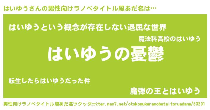 | 女子向けラノベタイトル風あだ名 | 『(仮)はいゆうのやんごとなき事情』 |