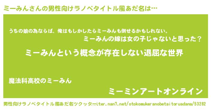 | 女子向けラノベタイトル風あだ名 | 『異世界で失敗しない100のミーみん』 |