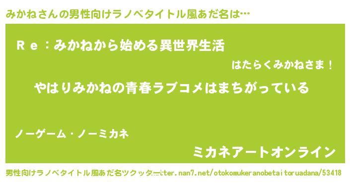 | 女子向けラノベタイトル風あだ名 | 『みかね伯爵の花嫁』『死神みかねの再婚』 |