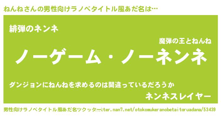 | 女子向けラノベタイトル風あだ名 | 『死神ねんねの再婚』 |